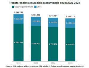 El relevamiento indicó que desde el 2022 las transferencias de fondos a las comunas han disminuido de manera considerable. Ese año, los municipios recibieron 5,741 billones de pesos, mientras que en diciembre de 2025 obtuvieron sólo 5,232. De esta manera, en 2023 los aportes cayeron 5,4%, en 2024 2,2% y el año pasado 1,6%.